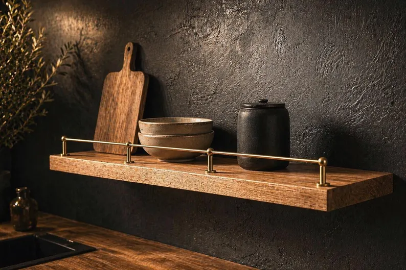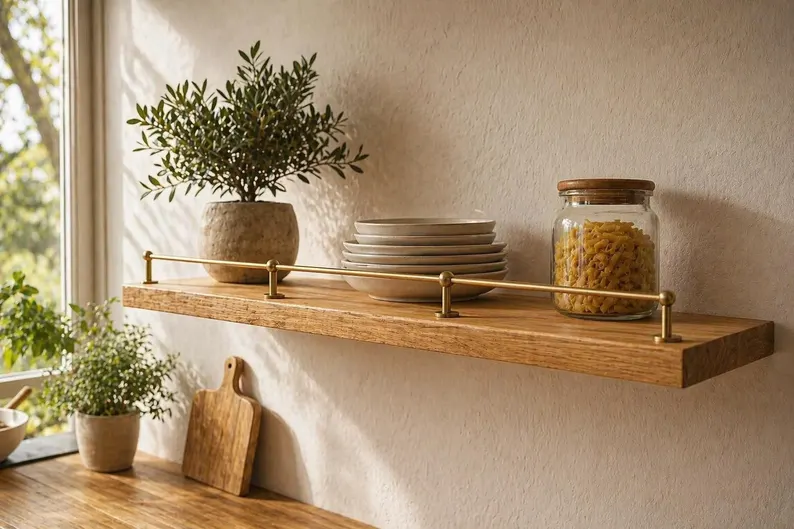 Cette étagère murale en chêne massif avec rail en laiton est conçue pour organiser une cuisine, un coin café ou un salon sans alourdir l’espace.