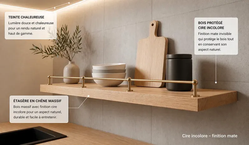 Cire incolore — respecte le grain naturel du chêne, rendu lumineux et doux au toucher.